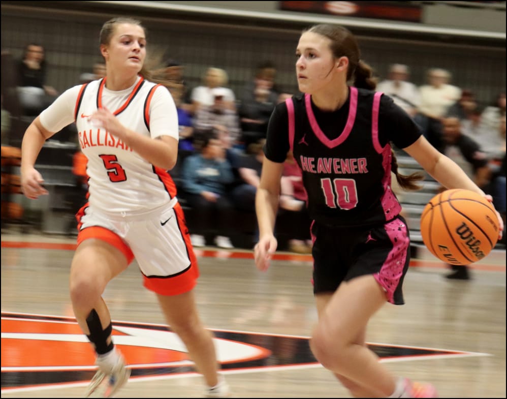 Heavener’s Lanie tries to drive past Sallisaw’s Hannah Palmer. Photo by DAVID SEELEY/Sequoyah County Times.