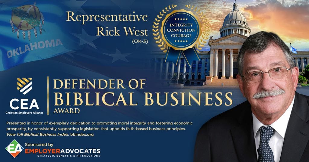 OKLAHOMA CITY – Rep. Rick West, R-Heavener, was one of 50 members of the Oklahoma Legislature to be recognized by the Christian Employers Alliance (CEA) because his voting record most aligned with biblical principles as measured by the Biblical Business Index (BBI).