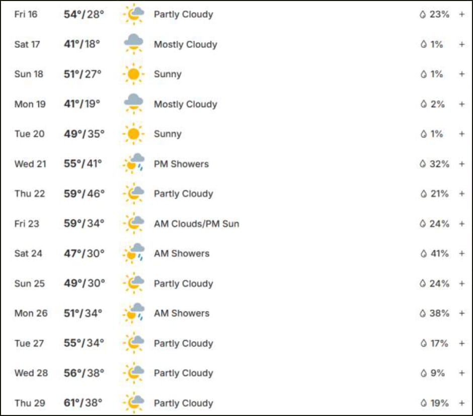 The high is forecast to be 51 degrees with a low of 35 degrees.