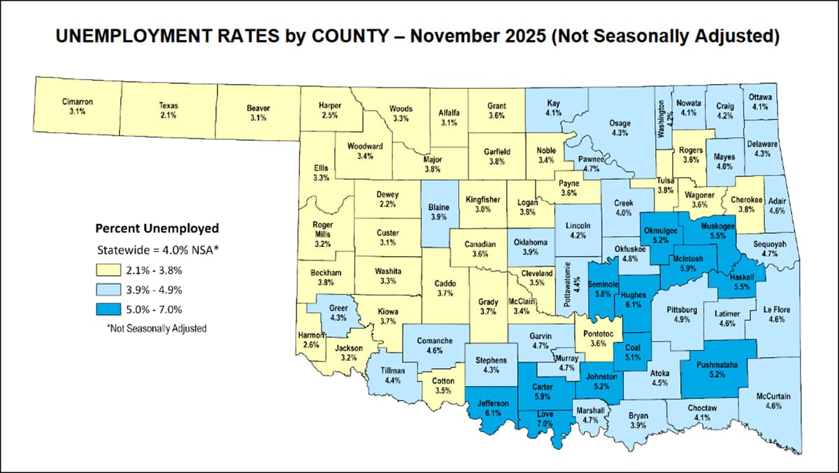 LeFlore County’s rate for the month was 4.6 percent compared to 3.9 percent for the same period last November. The rate also increased from the 4.3 percent rate from October.
