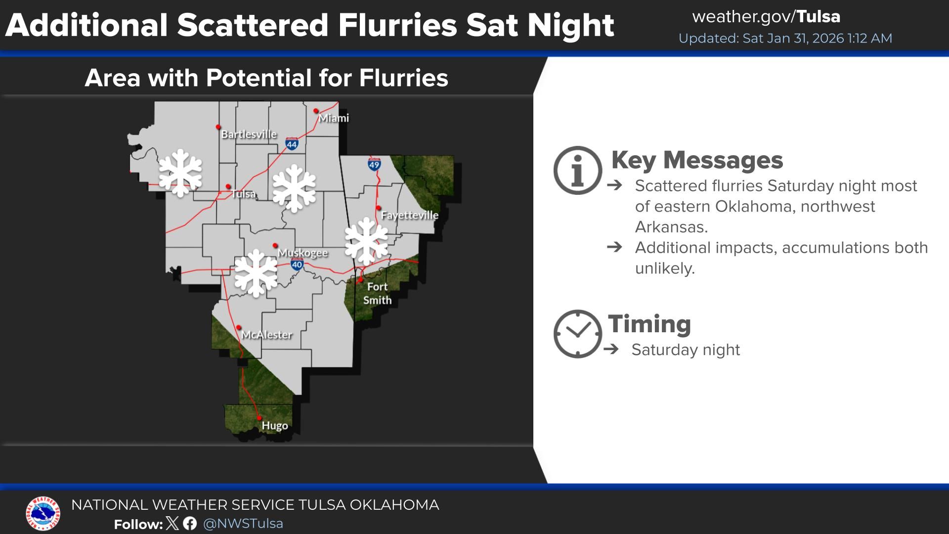 Light to moderate snow bands reducing visibilities this evening across far eastern Oklahoma and northwest Arkansas.