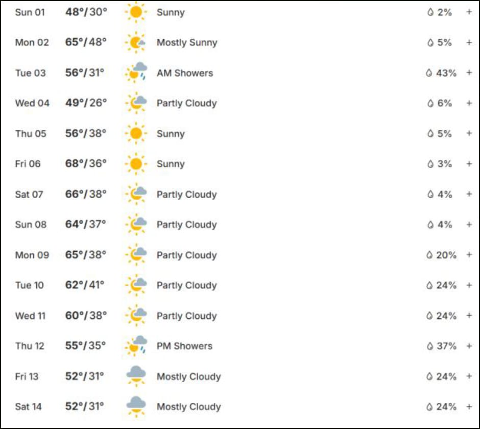 Friday’s high was 41 with a low of 12. No precipitation was received, leaving the monthly total to 2.77 inches. Average rainfall for January is 3.10 inches.