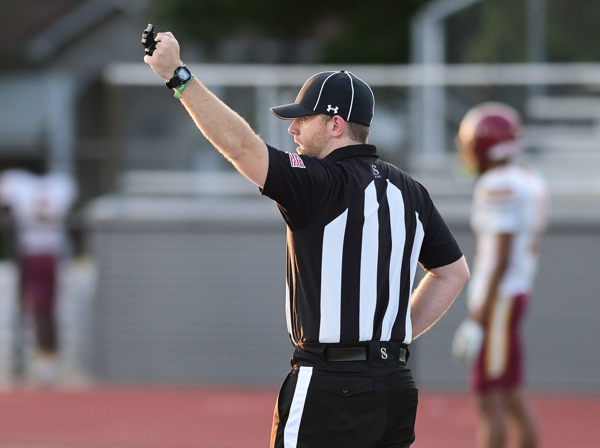 A football referee watches a play at a Norman high school game. The Oklahoma Secondary School Activities Association is responsible for training tens of thousands of referees and judges who oversee high school competitions. (Photo by Kyle Phillips/For Oklahoma Voice)