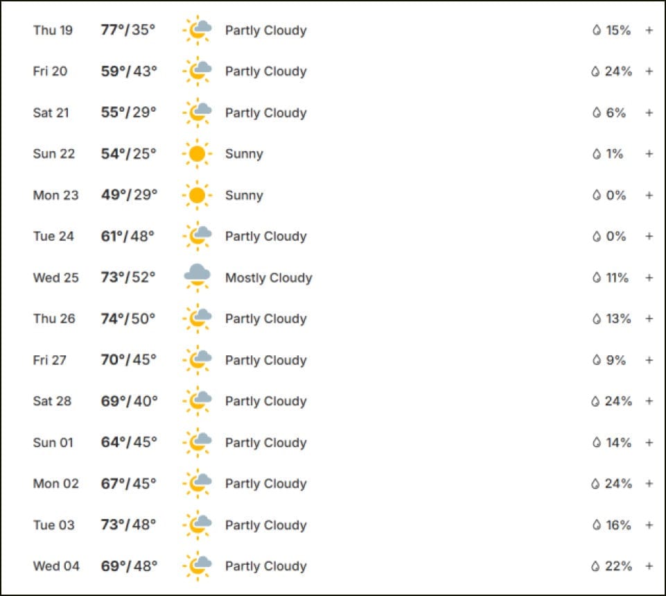 The high is forecast to be 77 degrees with a low of 35 degrees.